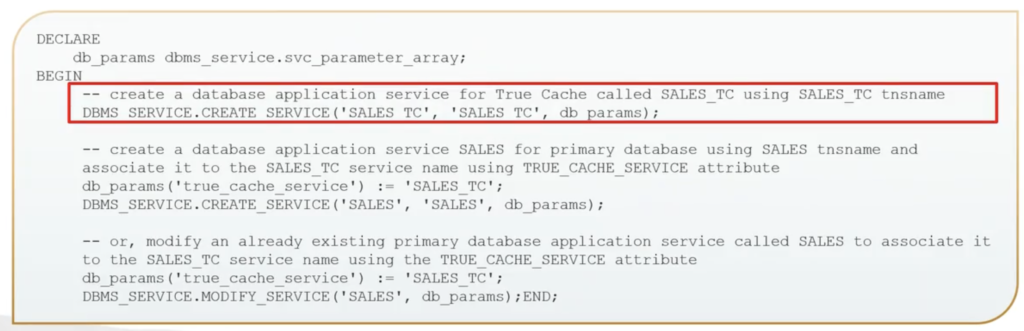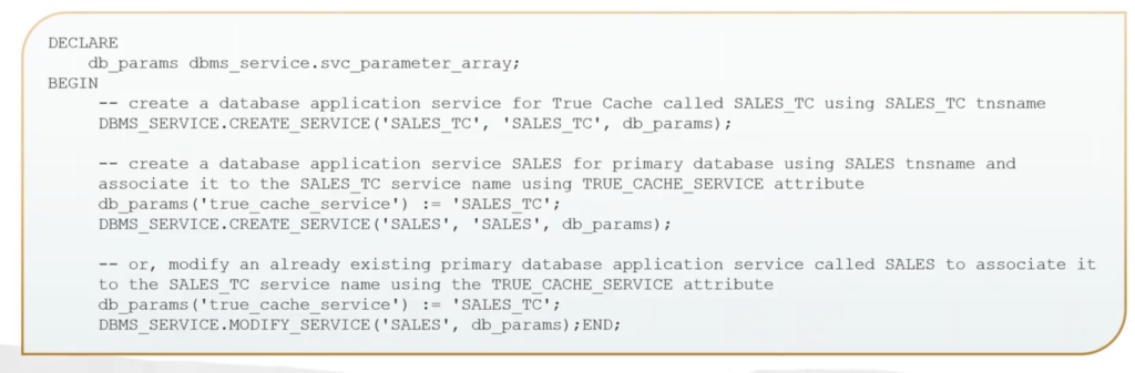 And then third, if you already have a service created, optionally, just modify an already existing primary database service called SALES. And here, we’re associating it to the SALES TC service, again using the TRUE_CACHE_SERVICE attribute. So create them, associate it. Or it’s already created, just associate it.