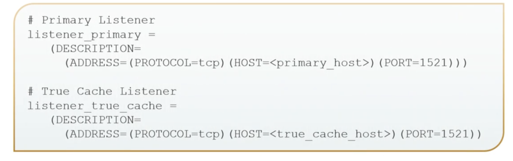 The primary database needs to have the instance network name and also the application service name. And then what about the listener for that primary database and also for your True Cache instances. So here’s a little sample entry.