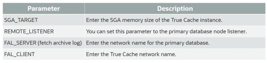 You do need to prepare a PFILE for startup. So you’re going to– what is the True Cache? What’s the instance? What’s the name going to be? My primary database instance. What’s going to be your unique name for my True Cache? And my DB files the same as my primary database instance. How much memory are you going to allocate to the SJ for that? Where is my parameter for the primary database node listening then?
