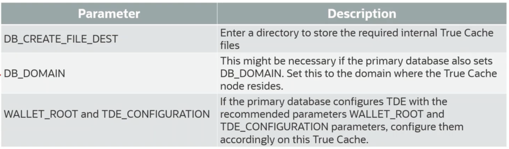 The DB create file destination to store the required internal True Cache instance files. Again, control file, temp files– where is that going to be at? I might need to set up my DB domain for where the node resides at and then also for my wallet route and the TDE configuration.