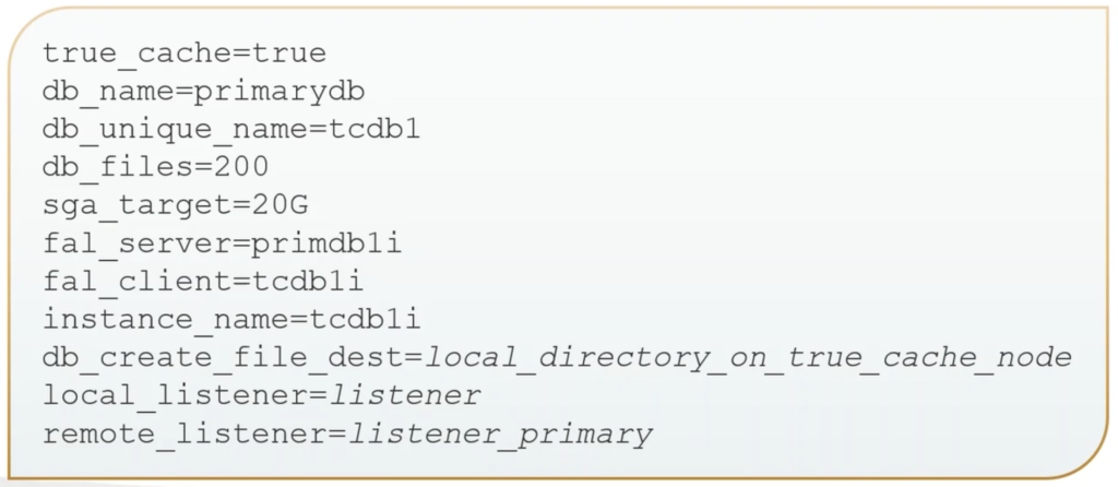 So here is a very simple example for the PFILE. OK. This instance is going to be True Cache. Same value as the one for my primary database– where is that? What is the unique name for this True Cache going to be? The number of database files– you want the same as the primary database. How much SGA am I going to give it?