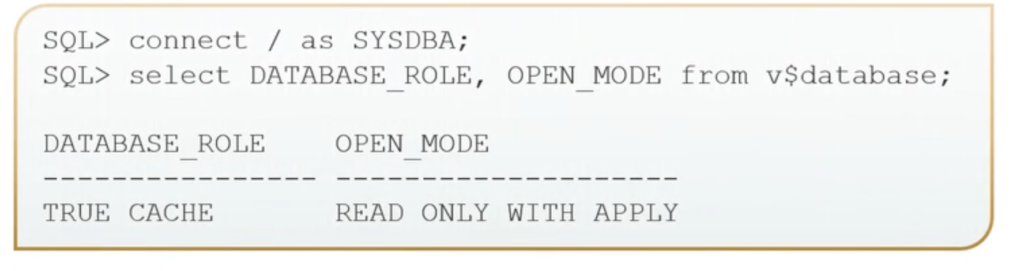 You can verify is the True Cache instance actually applying the redo and making progress a couple different ways. First, we want to verify that our True Cache instances are OPEN, READ ONLY WITH APPLY. This means that the true Cache Instance we do apply is actively working or should be actively working.