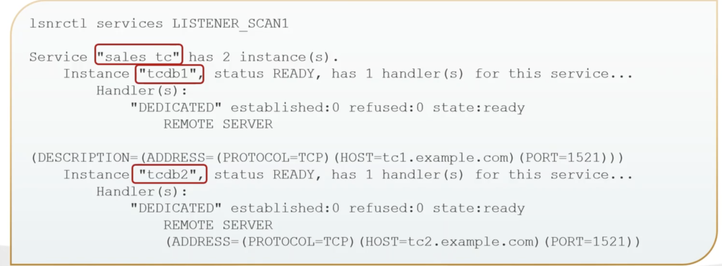 We want to make sure we want to validate our remote listener. So we’ve seen these before where we have our service names. And there’s our True Cache instances. So here, we see we have True Cache registered with the SCAN listener for a RAC primary database.