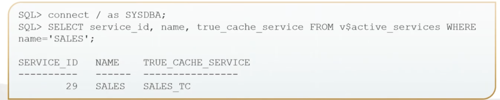 And select from that v$active_services. In this case here, we’re just looking for our sales. And here, we can see there is our sales from our primary database and then the SALES_TC from our True Cache instance.