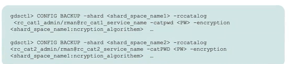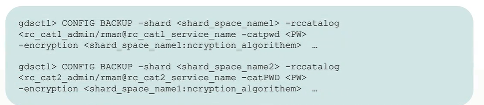 Now, if you’re going to have multiple recovery catalogs, as we talked about, you do a config backup here. This one you saw a couple of slides ago: instead of the shard being all, as you saw in the previous slide, you identify a particular shard space, then give a specification for that shard space, including the specific shard catalog. Then create another config for another shard space.