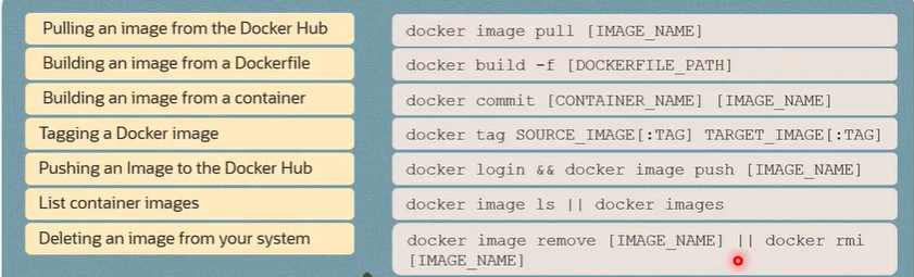 Removing an image uses either docker image remove or docker rmi, with the image name as the argument. Use this to clean up images you no longer need and free up disk space.